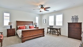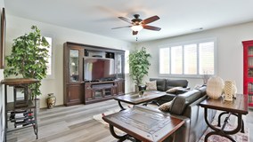 3 bed + loft, virtually new 2019 built home in South Corona! Upgraded luxury vinyl plank flooring throughout downstairs, with a convenient powder room located on the first floor for guests. The kitchen is open to the family room, complete with a large island with enough seating for 4. Kitchen comes with TONS of cabinet space, stainless steel appliances & granite countertops. Upstairs you will find a large loft and 3 large bedrooms. The spacious master bedroom comes with a ceiling fan & luxurious master bathroom attached. The master bath features tile flooring, quartz counters with 2 sinks + vanity area, separate shower & tub, & large walk in closet. The other 2 bedrooms are equally spacious with ample closet space, and share a hall bathroom room, complete with matching tile floor, dual sink & quartz counters. Outside you will find a fully landscaped, private backyard with low-maintenance astro turf. The home comes with solar panels, whole house fan, tankless water heater, water softening system & shutters throughout. Enjoy a prime location, with a community park & conveniently located near the 15 fwy.