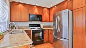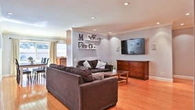 This nicely upgraded interior unit show well. With 3 bedroom and 2 bath, Master has its own bathroom. Decorative lighting with surround sound for entertaining, all bedroom have closet organizers. Hardwood floors in the kitchen, living and dining room. Upgraded doors with crown molding. Good size back patio and front patio. 2 car garage, which has lighting and completely drywalled. Could be used as an extra room. Dual pane windows.