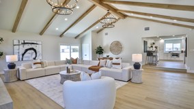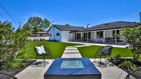 Aim for gold on Olympia! This fully remodeled North Tustin home offers modern luxury on an expansive 11,250 sq.ft. lot, featuring ultimate curb appeal & gated 45' RV PARKING. Every detail has been carefully considered, from the fun Dutch door with a convenient "Drop Zone" to the chef's kitchen boasting professional-grade stainless steel appliances: an 8-burner stove w/ double ovens, high CFM hood vent, drawer microwave, dishwasher & refrigerator. You'll love the waterfall quartz countertops & full backsplash, pot filler, & a pop-up outlet in the island w/ inductive cell phone charging. Separate sink at the beverage bar center, dual-zoned wine/beverage refrigerator & floating shelves. All adjacent to the dining room. The living room offers a truly breathtaking living space w/ cathedral ceilings, exposed beams & 2 romantic chandeliers, offering ample room for a game area or additional dining. Two beautifully adorned gas fireplaces w/ decorative glass & fireball finishes add warmth & ambiance. The primary suite is a serene retreat w/ a large closet & a gorgeous bathroom featuring dual sinks, LED backlit mirror, dreamy three-head shower w/ backlit shampoo niche & floor. Both bathrooms boast smart electronic toilets w/ heated seats/water & dryer functions, foot sensor flush, auto open/close, digital display & a remote. Two additional spacious bedrooms each have a slider for backyard access. This home is truly updated, with a new HVAC system & new ducting, water heater, updated waste lines (ABS), new Pex repipe, new valves & updated electrical outlets/switches. Energy-efficient updates include recessed LED lighting throughout, bedrooms pre-wired for ceiling fans, Nest thermostat & blown-in insulation in attic. High-quality hardware, solid wood shaker doors, opaque glass closet doors, light fixtures & finishes throughout. The professionally hardscaped & landscaped yards feature all new concrete, including the driveway & RV pad (patio excluded), water-saving artificial turf & a drip sprinkler system. The huge backyard offers an expansive covered patio w/ room for outdoor dining & lounging, a fire pit & 3 self-watering raised planter beds ready to yield Olympic sized vegetables. Extensive quality trees & plants utilized, with Podocarpus hedge trees planted on sides for future privacy. There's even additional space for a dog run or future fruit trees. Electric car or RV outlet in garage. This home is zoned for Foothill High School & is in the award-winning Tustin Unified School District.