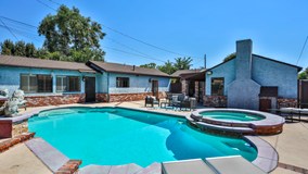 Don’t miss this stunning 4-bedroom pool home on a generous 8,162 SF lot, complete with a fully permitted ~436 SF pool house/recreation room! This beautifully designed residence features 4 bedrooms and 2 bathrooms, with a well-thought-out floor plan that includes a formal living room and a large cozy family room with a large fireplace that opens to the pool—perfect for relaxing or entertaining. Enjoy seamless indoor/outdoor living with direct access to the backyard oasis. The chef’s kitchen is fully equipped with a Sub-Zero fridge/freezer, double ovens, a warming drawer, deep fryer, and abundant cabinetry. It opens to both the dining area and living room, creating an ideal space for entertaining. Gleaming hardwood floors flow throughout, and the rear bedroom offers direct access to the pool and spa through sliding glass doors. Step outside to an entertainer’s dream backyard featuring a sparkling pool and spa with waterfall, multiple seating areas, and plenty of space for gatherings. The detached and fully permitted pool house includes a kitchen and ¾ bath, offering great ADU potential. Additional highlights include a large carport, detached garage, and ample parking and storage throughout.