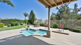 Welcome to this beautiful Rancho Via Verde 4 bedrooms and 3 bathrooms home situated on a quiet cul-de-sac. The grand entrance welcomes you with an open floor plan and an abundance of natural light throughout. Both the living room and dining room offer vaulted ceilings for the open feel buyers are looking for. The renovated kitchen is designed for intimate family dinners or large gatherings and entertaining. Newer professional grade appliances complement the newer cabinets and granite countertops. On the main level, there is 1 bedroom with a full restroom that is perfect a guest room or that elusive down stairs bedroom needed for family members who prefer not to go upstairs . The Master bedroom is very spacious and offers a two sided fireplace, deck with mountain views, walk in closets, office area and ensuite restroom with high ceilings. Entire home has been tastefully renovated with modern design and finishes. Upgrades and amenities include, Dual pane windows, 200 amp Electrical service, Natural stone flooring, modern updated restroom, interlocking paver driveway, 3 car garage, pebble finish hardscape in back yard, in ground Spa, custom window coverings, indoor laundry room and even a wet bar. Current owners are the original owners and bought this model home from the builder. This home has been meticulously maintained and loved.