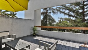 This stunning top floor penthouse in prime Pasadena location offers convenient accessibility to Paseo Colorado, Old Pasadena and the Playhouse District. Unparalleled privacy, 9’ ceilings and limestone floors are just a few of the special features here. Expansive windows and 4 skylights make this space exceptionally light and bright. Exquisitely appointed, the living room offers amazing treetop views, custom 92” tall French doors opening to a private balcony, gas fireplace and recessed lighting. The attractive kitchen features built-in wine fridge, gas cooktop, custom track lighting, Culligan reverse osmosis water filtration system, skylight, stone countertops and walk-in pantry. Both baths have been tastefully remodeled with stone and marble accents. The spacious owner’s suite is a lovely retreat and features bamboo flooring, 92” French doors opening to private deck, and walk-in closet. Additionally, there’s a second walk-in closet for the second bedroom and an abundance of storage in numerous closets throughout. There are also skylights in the owner’s suite bath, closet and separate laundry room. With nearly 400 square feet of private deck space, this truly is an exceptional find for spectacular sunsets, quiet and peaceful living.
