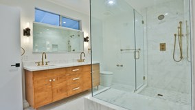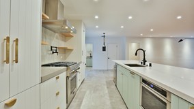 Kenter Canyon Mid-Century Charmer. In the heart of Brentwood, with canyon views and an inviting, open floor plan, sits this stunning home with countless details and timeless charm. A complete renovation with hard wood floors, subtle lighting touches, new landscaping, and all new surfaces. Designers maintained a clean and sophisticated ambiance that makes this home feel warm and welcoming. Great-room with kitchen, living room and dining room is surrounded by floor-to-ceiling sliding glass doors and ample natural light. Full chef's kitchen includes Thermador appliances and Caesarstone countertops. Two separate outdoor seating areas and a media room round out this complete and tasteful home, ready to begin a new chapter.