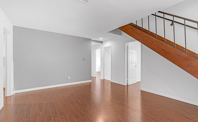 The open floor plan features an oversized living and dining room with high ceilings, large bright windows, and rich wood floors. The remodeled kitchen boasts quartz countertops, marble floors, and custom cabinetry. The first floor includes three spacious bedrooms and two fully remodeled bathrooms with modern fixtures, quartz, and marble.