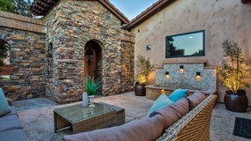 Elegance meets warmth in this Tuscan Style Montelena custom home. Canfield Place is a corner lot situated on a very private cul-de-sac with NO Mello-Roos and LOW HOA. Located within the highly acclaimed Poway Unified School District, and only minutes from the RB Swim & Tennis Club (your new club), and walking distance to the award winning Rancho Bernardo Inn. Enter this stunning custom via your grand stone portico that leads to your private front courtyard adorned with built-in fountain and custom mounted TV (perfect for entertaining). Grand main entrance leads to travertine flooring throughout first floor showcasing a formal dining room, living room with fireplace, family room with fireplace, chef’s kitchen, informal dining area, office nook, bar/pantry, wine cellar and guest bathroom.