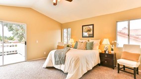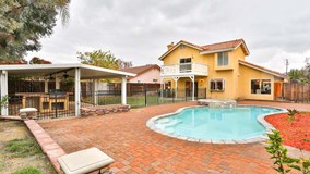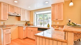 tops, custom kitchen cabinets, breakfast bar, new fixtures, recessed lighting and a great view of the backyard. Just off the kitchen is the large family room. Nice floors, rock fireplace, sliding glass door, ceiling fan and wet bar, complete this room. Downstairs is also a common bathroom, one bedroom, laundry room and direct garage access. Upstairs, you will find 2 more bedrooms and the master bedroom with balcony. Also upstairs in a landing area with storage cabinets. All of the rooms have new paint, new carpet and ceiling fans. The hall bathroom has tile floors, shower in tub and vanity. The master bathroom has tub/shower and dual sinks. In the backyard, you will find the gorgeous pool,