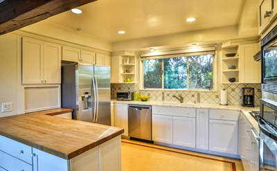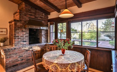 The kitchen features a cozy breakfast area boasting a charming old brick barbeque with rotisserie and gleaming copper hood, built-in china cabinet, butcher block and tile counters, pull out drawers, appliance garage, spice cabinet, microwave, dishwasher and large pantry.