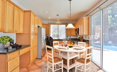 Beautiful pool home in the Mountain Gate area. This home has curb appeal w/custom inlay in driveway, wood & iron garage door & front door, landscaped front yard & custom paint. Step into soaring ceilings that make this home feel welcoming & spacious. The formal living & dining rooms feature fresh paint while the dining room features crown molding & chair railing molding. The beautiful custom tile flooring w/upgraded baseboards flows throughout the formal living & dining rooms to the family room & kitchen. The family room has a fireplace w/custom tiled hearth, entertainment niche, & lighted ceiling fan. The kitchen is just off the family room & features beautiful black granite counter tops w/black appliances, contrasting beautifully w/the maple cabinets & includes pantry, recessed lighting & desk area. Head up stairs to the master bedroom w/vaulted ceilings, lighted ceiling fan, Brazilian cherry hardwood floors w/upgraded baseboards. The master bathroom has dual sinks, separate shower & tub, toilet stall, & walk in closet w/custom shelving. The remaining 3 bedrooms feature the same beautiful Brazilian cherry hardwood floors & raised baseboards, lighted ceiling fans & mirrored closet doors. The backyard is your very own staycation w/custom pool & fire pit surrounded by greenery. This home backs up to a greenbelt w/walkways to Mountain Gate park & is also walking distance to the elementary & middle schools, & shopping.