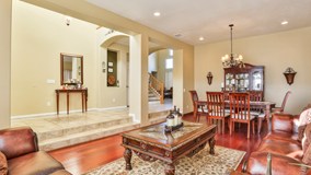 Beautiful South Corona Pool Home in the Mountain Gate Area. This home is a must see! Step into an entry way with beautiful tile flooring and soaring ceilings. The Living Room and Dining Room have beautiful hardwood flooring and recessed lighting. The tile flooring continues through to the Family Room with Entertainment nooks, High Ceilings, and Fireplace. The Kitchen is just off the family room and features beautiful dark bead board cabinets, gorgeous granite counter tops, stainless steel appliances and a large kitchen island with Breakfast Bar. The Kitchen has a large in kitchen eating area. Downstairs also features a bedroom with full bathroom. Upstairs is a large Master Bedroom with in suite master bathroom with separate bath tub and shower, tile flooring and his & her sinks. The master bathroom also features a walk in closet with mirrored closed doors. The 3 additional bedrooms are all spacious and feature ceiling fans. The third bathroom has recessed lighting, dual sinks and bath and shower combo. The backyard features a beautiful pool and spa, fire pit, as well as a built in BBQ area with covered patio, ceiling fan, sink and stained concrete counter tops. The backyard also includes a cabana (un-permitted) that includes shower, sink, toilet and urinal fully finished with beautifully tiled shower and floor.