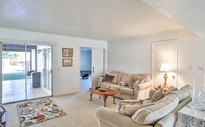 Check out this sweet entertainer’s delight on a corner lot with just one neighbor set amidst Green Tree Golf Course. You’ll love taking walks through this neighborhood! As you enter the house, you’ll find abundant living space and a bright and cheery feel, thanks to the new carpet throughout and the new interior and exterior paint. Imagine the memories you can make in the spacious living room with its cozy fireplace. Cook up a great meal in the kitchen and enjoy the easy cleaning of Corian counters. Plus, the kitchen sink has filtered drinking water on tap to help you live healthier. With a great flow from the large dining area through the French doors onto the even-larger covered patio, you can comfortably host gatherings large and small. The over-sized 4th bedroom could make a great home office, gym, game room, or entertaining space since it has its own sliding door to the patio. The hall bathroom has been updated with a beautiful tile tub surround, a new vanity, new flooring, and a new vanity light. The central evaporative cooler, central heating, and double-paned windows will keep you comfortable year-round. Need to get away from stairs? With just one step up from the driveway to the front door and no steps inside, this home is easily accessible. Direct access from the garage to the kitchen makes loading and unloading a snap. You’ll also enjoy the convenience of a remote-controlled garage opener. The concrete driveway is big enough to park multiple cars or an RV in addition to the 2-car garage. You’ll love having easy access to all the essentials. Costco, Food for Less, Starbucks, Rite Aid, and a variety of other shops and restaurants are all within just 5 minutes’ drive, per Google. Living less than a mile from the I-15 access ramp means less time driving and more time living. Don’t forget to check out the video tour and 3D virtual tour. Welcome home!