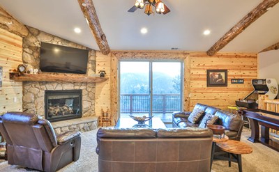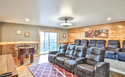 Unrivaled ski slope views from the largest home currently on the market in all of Moonridge. Spanning 3,539 Sq Ft and clad in knotty cedar siding and log accents, this majestic lodge abounds in quality craftsmanship and rustic mountain elegance. Amenities include 6 bedrooms and 5 bathrooms, game room, 10-seat private home theater, back deck with hot tub and BBQ, concrete driveway, 440 Sq Ft 2 car garage, laundry room, and extensive decking to enjoy some of the most iconic views in Big Bear. Well-appointed chef's kitchen features granite slab counters, custom cabinets, a large island, top-of-the-line appliances, luxury finishes, and attached formal dining. Spectacular great room offers vaulted ceilings, large wood beams, and beautiful floor to ceiling stone fireplace. Recently established vacation rental.