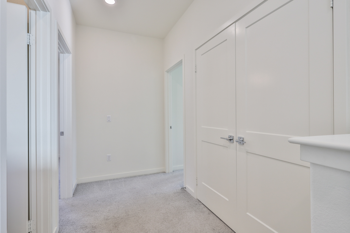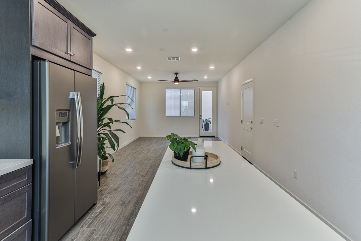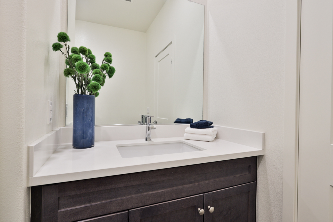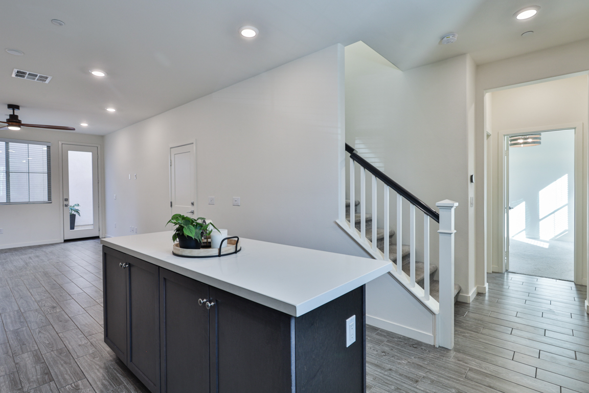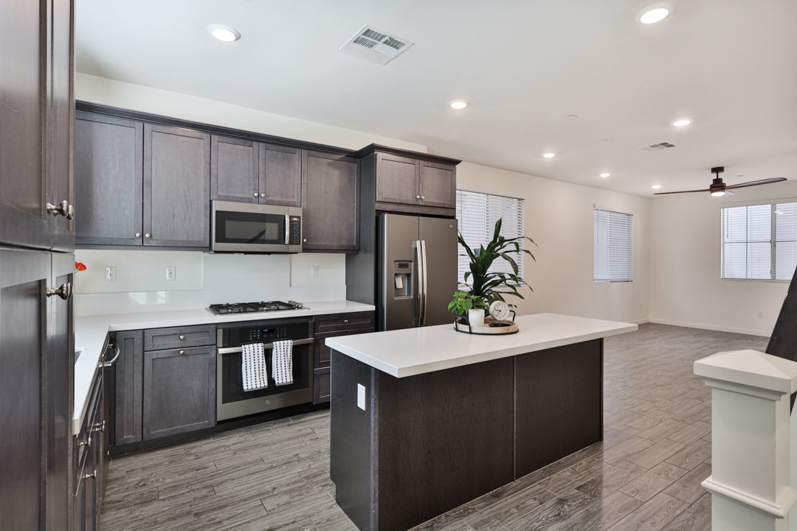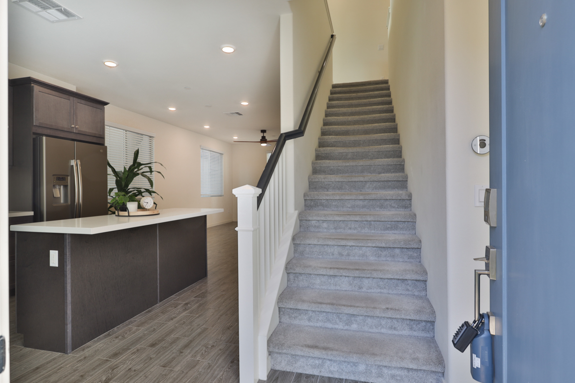 One bedroom and one full bathroom located downstairs on the ground floor. Open light filled floor plan, great room, nook/dining area, large loft/den upstairs, high ceilings throughout. Kitchen with upgraded features including; stainless steel refrigerator, stainless steel farmhouse sink, quartz countertops, shaker style cabinets and island. Primary Master bedroom features a walk-in closet and large bathroom with dual vanities. Indoor laundry nook includes both washer and dryer.