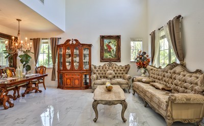 From the moment you enter through the grand double doors, you’re welcomed by soaring ceilings, abundant natural light, and a seamless open-concept layout that invites both everyday living and memorable entertaining. The formal living and dining rooms are generously proportioned—ideal for gatherings—while the expansive family room flows effortlessly into a chef’s kitchen, featuring a large center island, granite countertops, and custom tile backsplash.