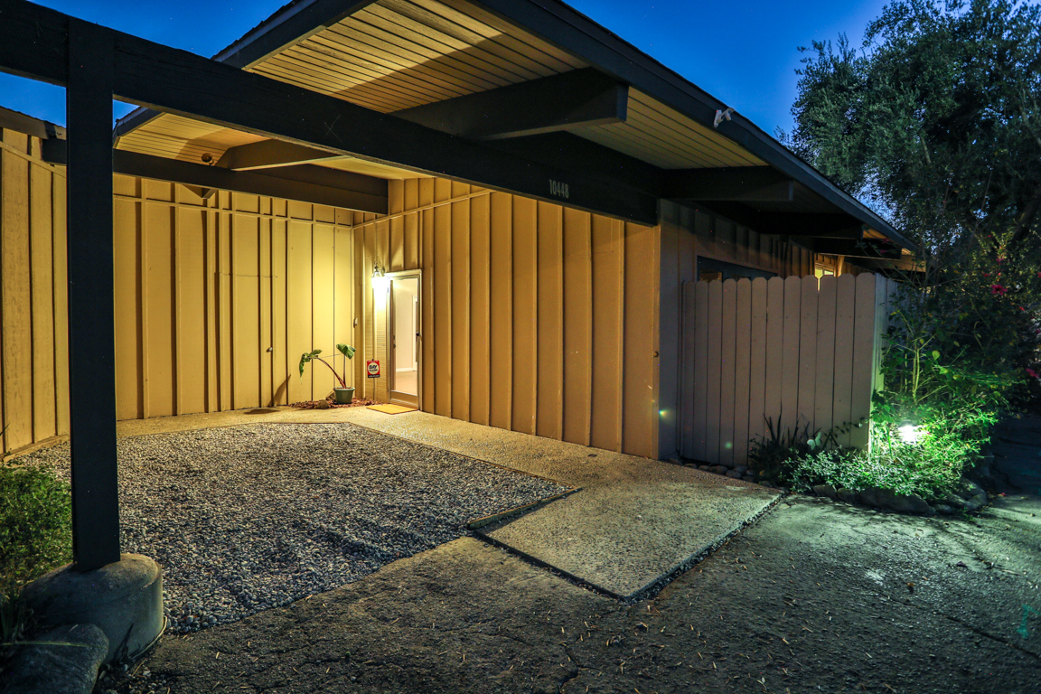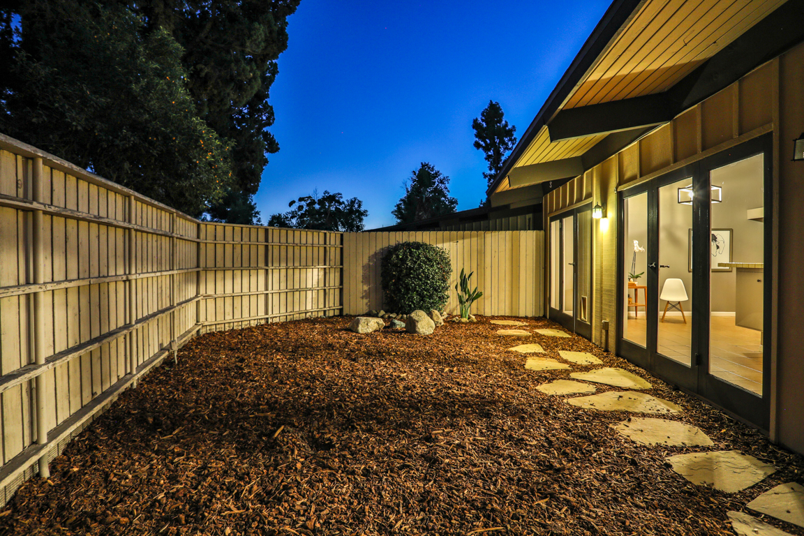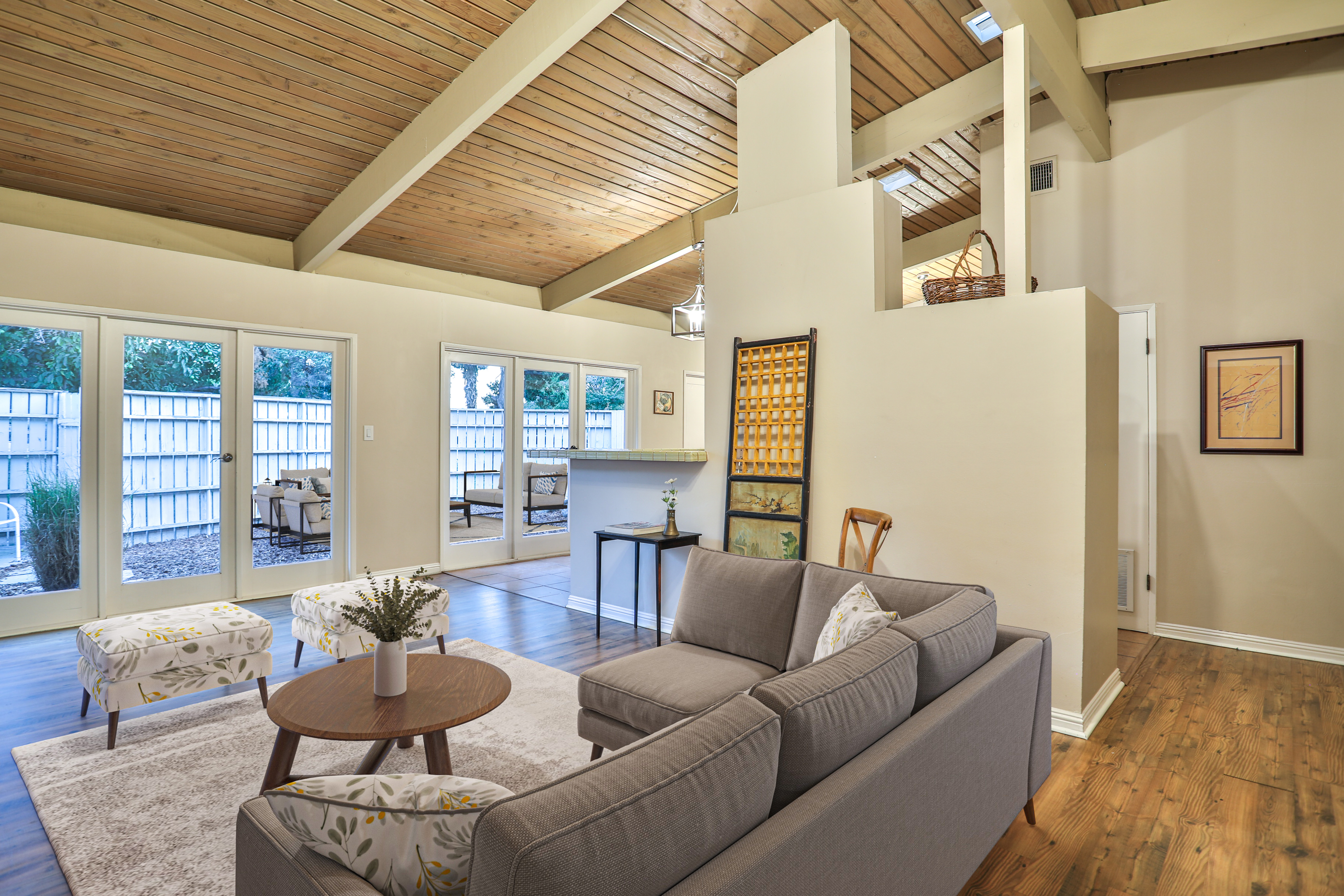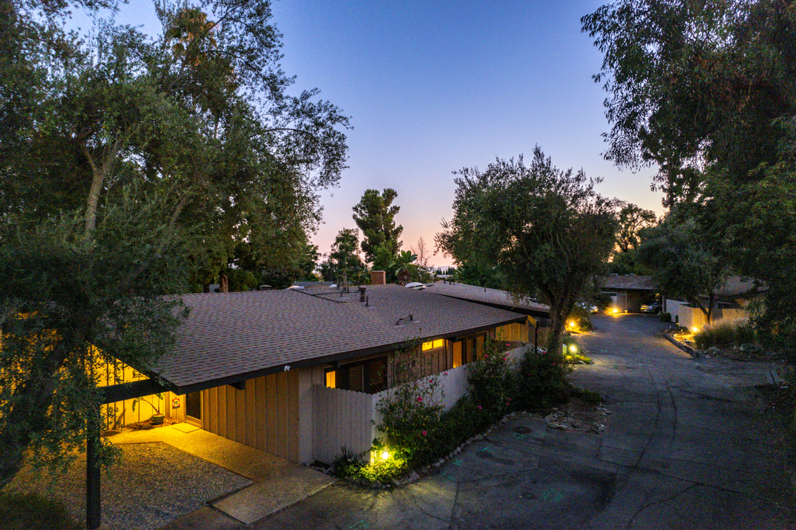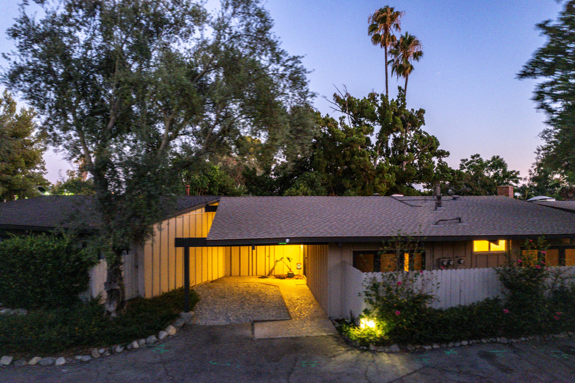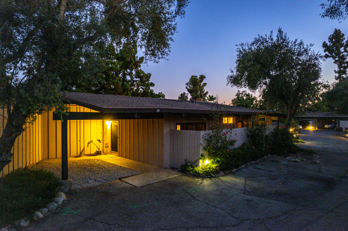 COVETED ALTA LOMA GARDENS MID CENTURY LIVING. Single story condominium on a spacious private elevated lot. Enjoy a sun lit open concept floor plan with high vaulted wood beamed ceilings plus wall-to-wall glass picture windows and clear glass doors. Kitchen with eating counter opens to dining and family living rooms. Spacious indoor laundry room. Includes carport, walk-in storage room, plus plenty of guest parking. Tranquil common grounds provide a community pool, giant trees, exotic plants, and ...