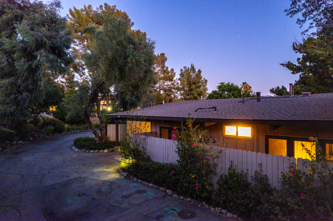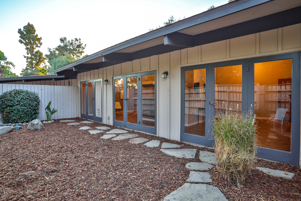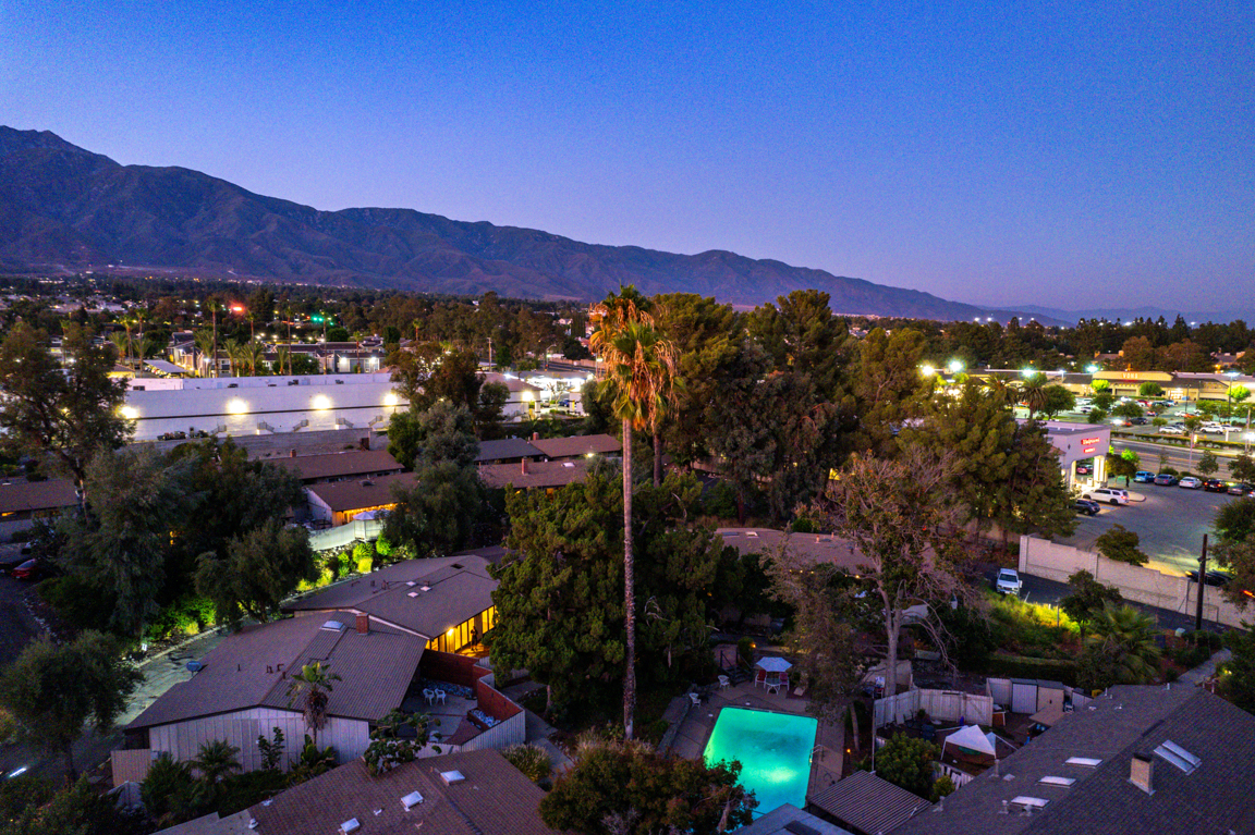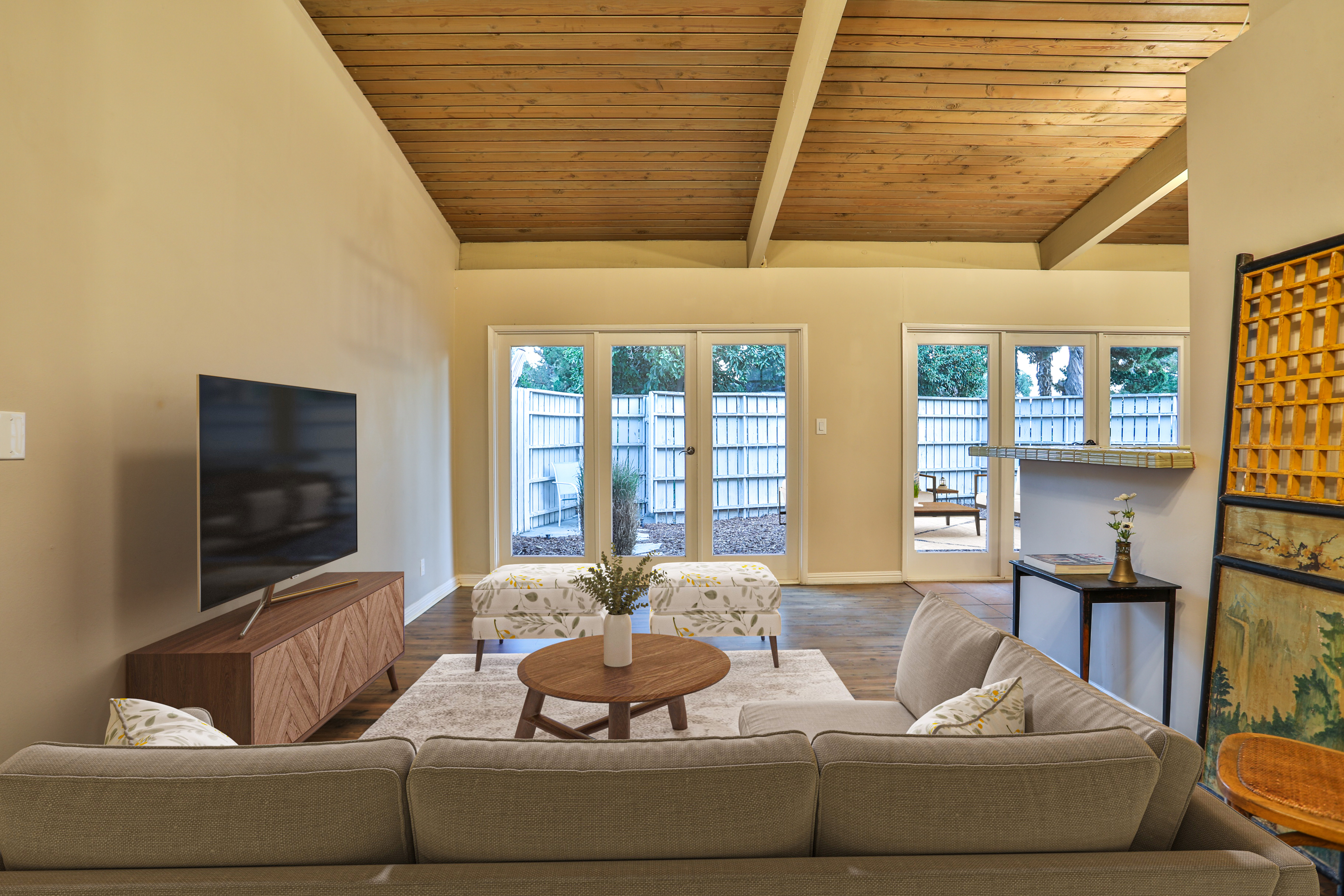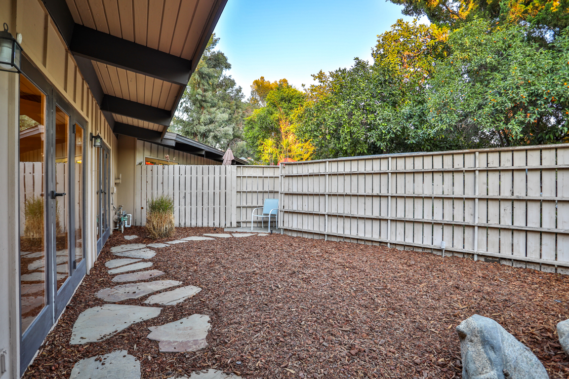 COVETED ALTA LOMA GARDENS MID CENTURY LIVING. Single story condominium on a spacious private elevated lot. Enjoy a sun lit open concept floor plan with high vaulted wood beamed ceilings plus wall-to-wall glass picture windows and clear glass doors. Kitchen with eating counter opens to dining and family living rooms. Spacious indoor laundry room. Includes carport, walk-in storage room, plus plenty of guest parking. Tranquil common grounds provide a community pool, giant trees, exotic plants, and ...