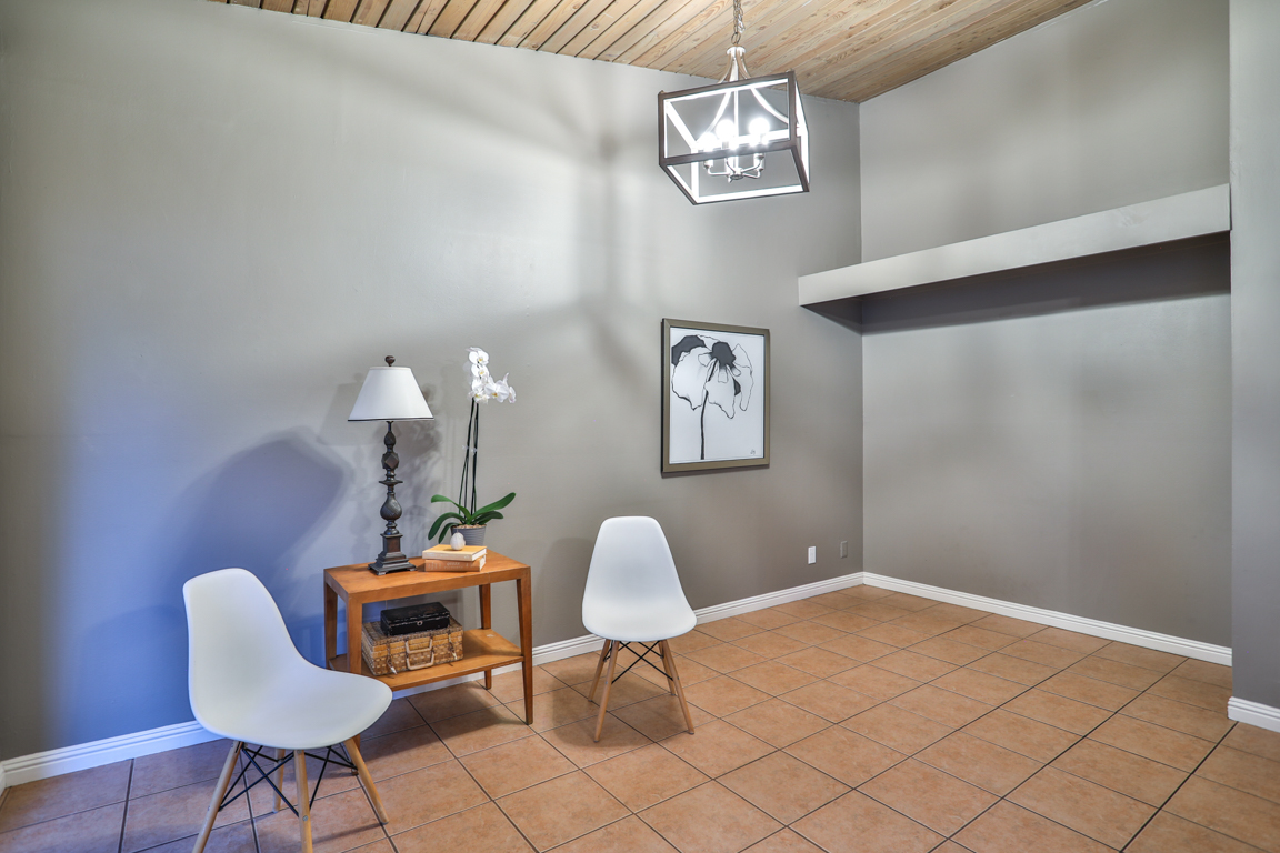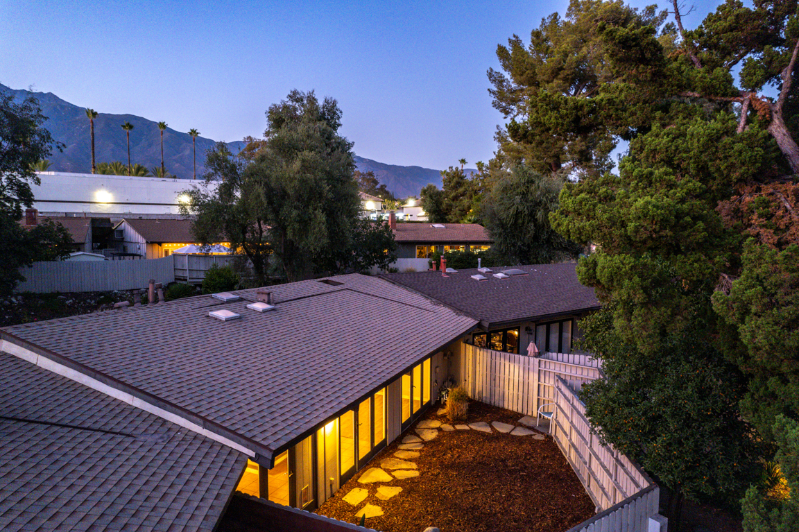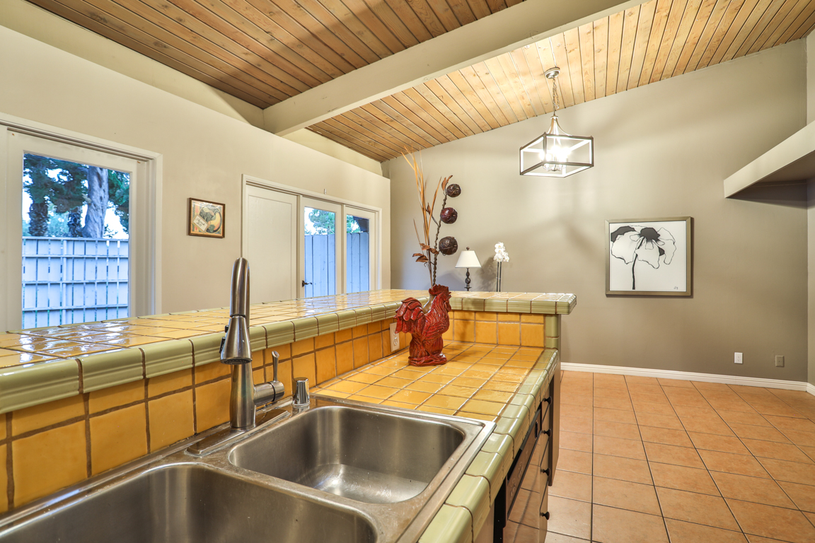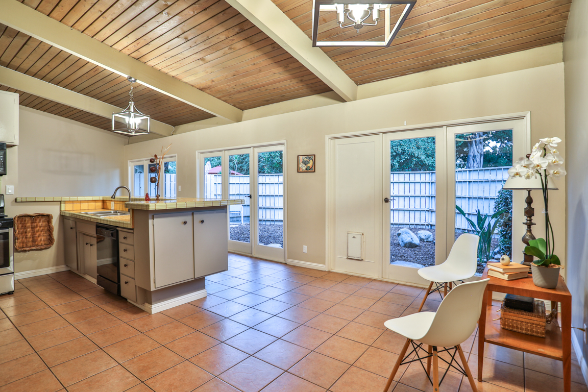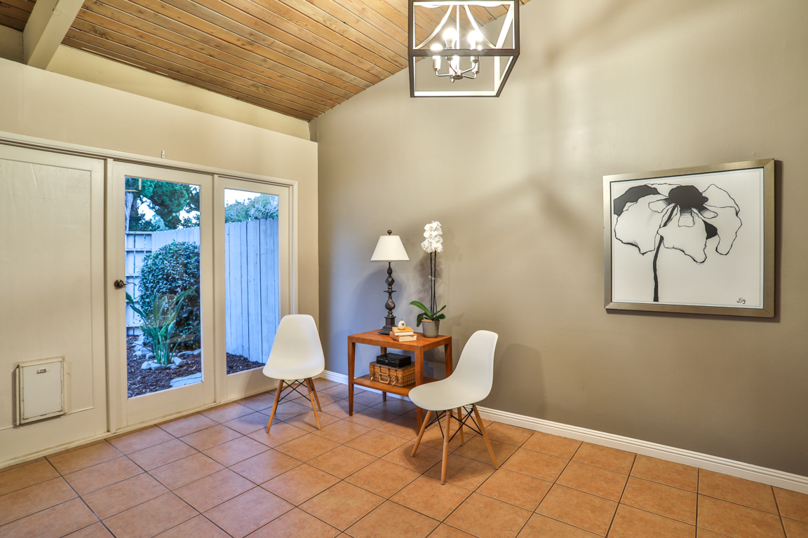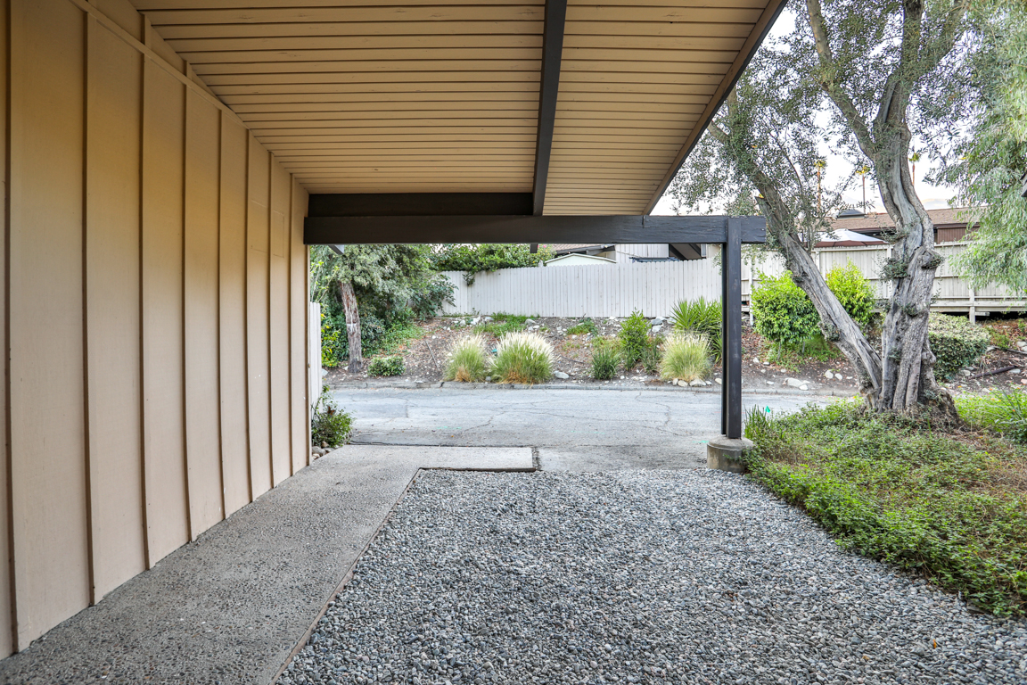 COVETED ALTA LOMA GARDENS MID CENTURY LIVING. Single story condominium on a spacious private elevated lot. Enjoy a sun lit open concept floor plan with high vaulted wood beamed ceilings plus wall-to-wall glass picture windows and clear glass doors. Kitchen with eating counter opens to dining and family living rooms. Spacious indoor laundry room. Includes carport, walk-in storage room, plus plenty of guest parking. Tranquil common grounds provide a community pool, giant trees, exotic plants, and ...