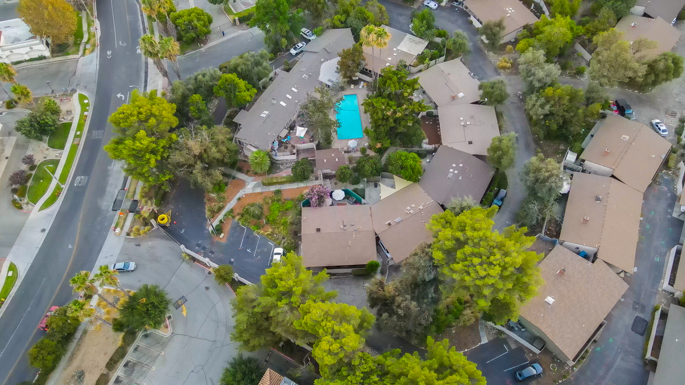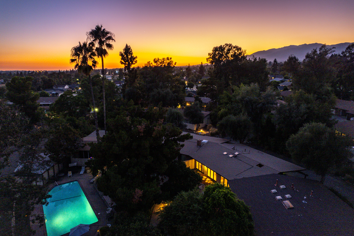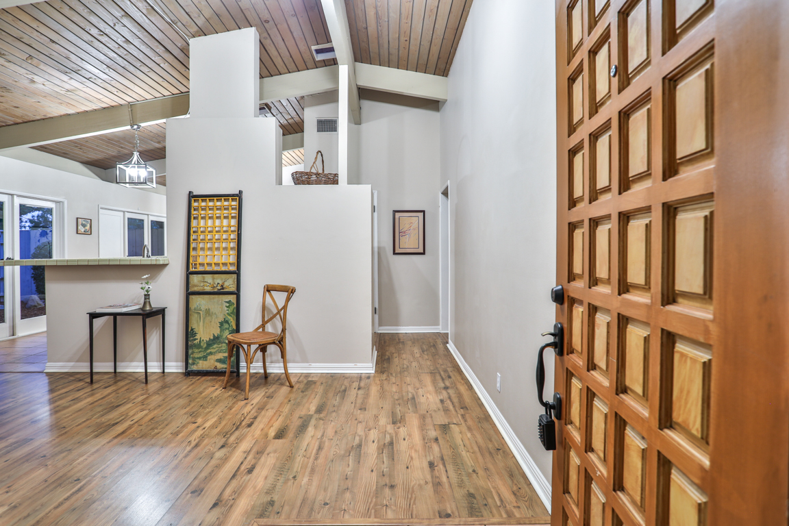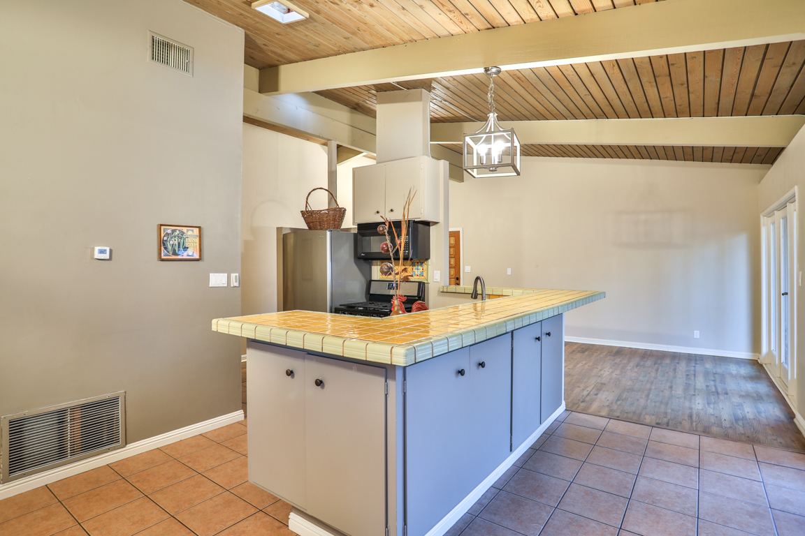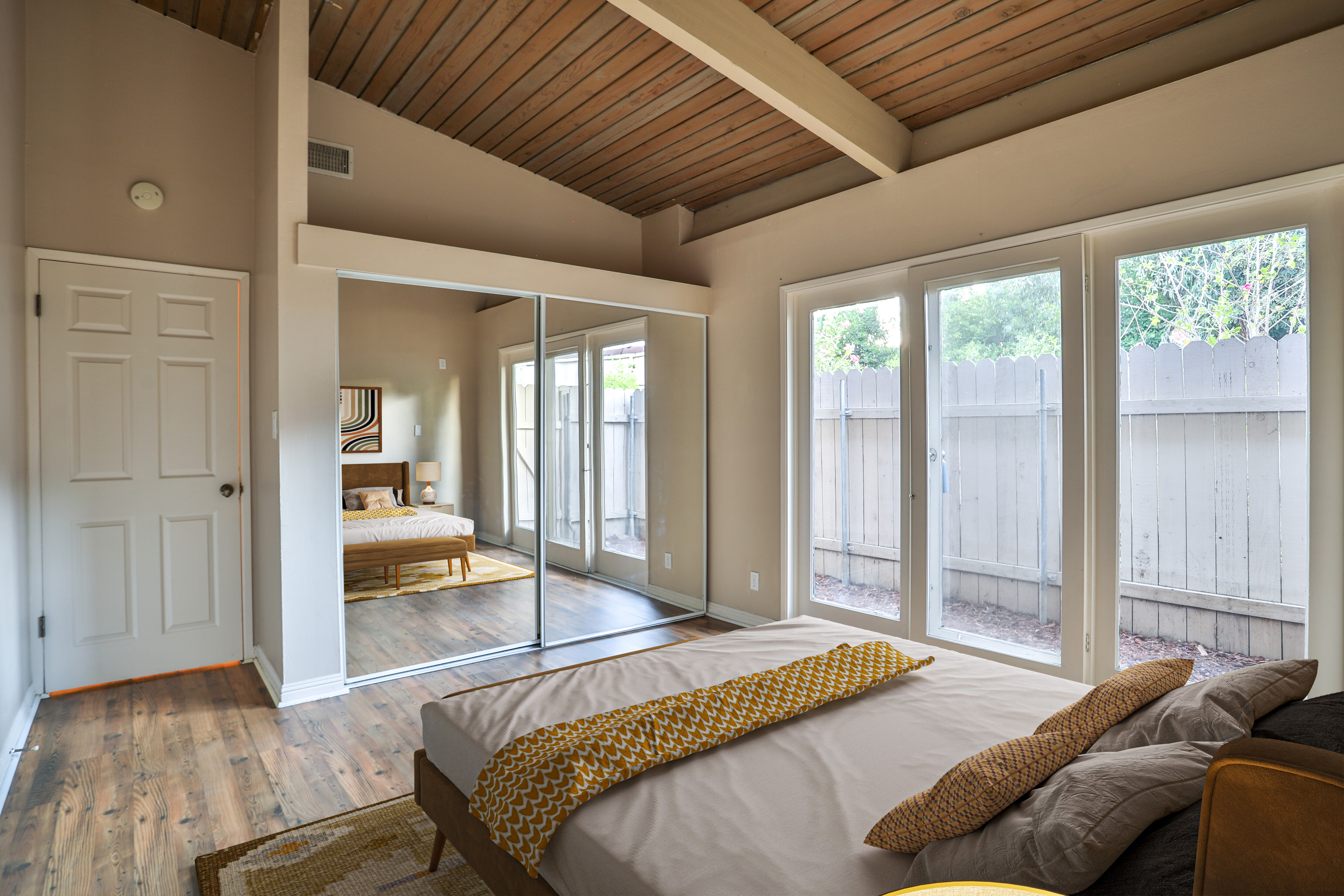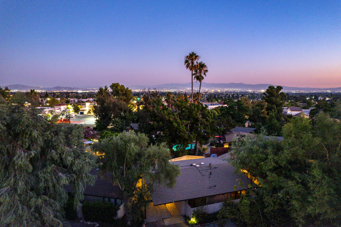 COVETED ALTA LOMA GARDENS MID CENTURY LIVING. Single story condominium on a spacious private elevated lot. Enjoy a sun lit open concept floor plan with high vaulted wood beamed ceilings plus wall-to-wall glass picture windows and clear glass doors. Kitchen with eating counter opens to dining and family living rooms. Spacious indoor laundry room. Includes carport, walk-in storage room, plus plenty of guest parking. Tranquil common grounds provide a community pool, giant trees, exotic plants, and ...