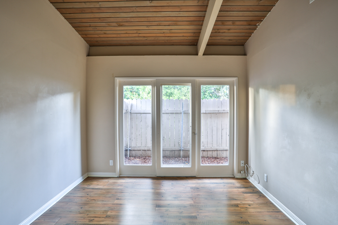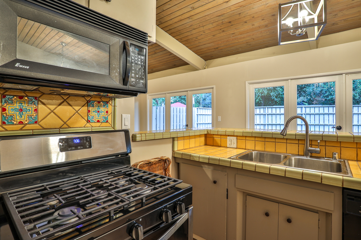 COVETED ALTA LOMA GARDENS MID CENTURY LIVING. Single story condominium on a spacious private elevated lot. Enjoy a sun lit open concept floor plan with high vaulted wood beamed ceilings plus wall-to-wall glass picture windows and clear glass doors. Kitchen with eating counter opens to dining and family living rooms. Spacious indoor laundry room. Includes carport, walk-in storage room, plus plenty of guest parking. Tranquil common grounds provide a community pool, giant trees, exotic plants, and more. Your own private oasis! Prime locale near shopping and transportation.