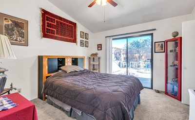 As you step inside, you’ll be impressed by the warm and inviting atmosphere, with ample natural and recessed light filling the space to the top of the cathedral ceilings. The well-designed layout features two comfortable bedrooms, providing plenty of room for rest. The shared bathroom boasts modern fixtures and is just steps away from the bedrooms.