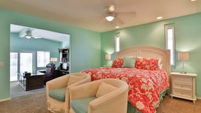 The main floor right side of home features a large hallway bathroom with 2 bedrooms and the master suite with a large step down sitting area which is used as an office. Huge master bathroom with a jetted tub and walk in shower. Open the sliding doors to the Fun zone (backyard).