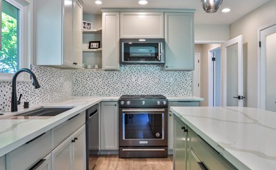 splash, custom soft close cabinets, chic black hardware, Kitchen-Aid appliances, wine cooler and ample pantry. Both completely renovated bathrooms have large custom floating vanities with LED down lighting and ceramic tile.