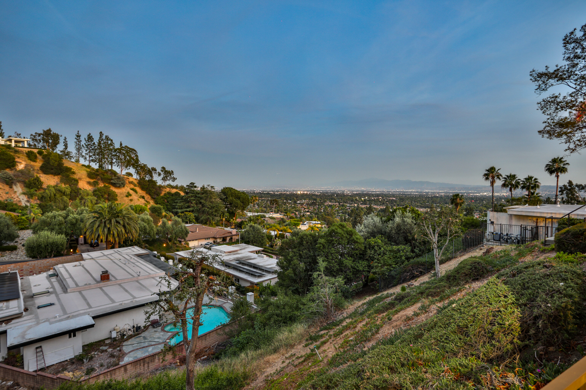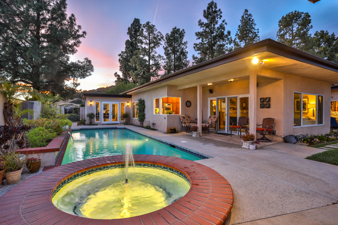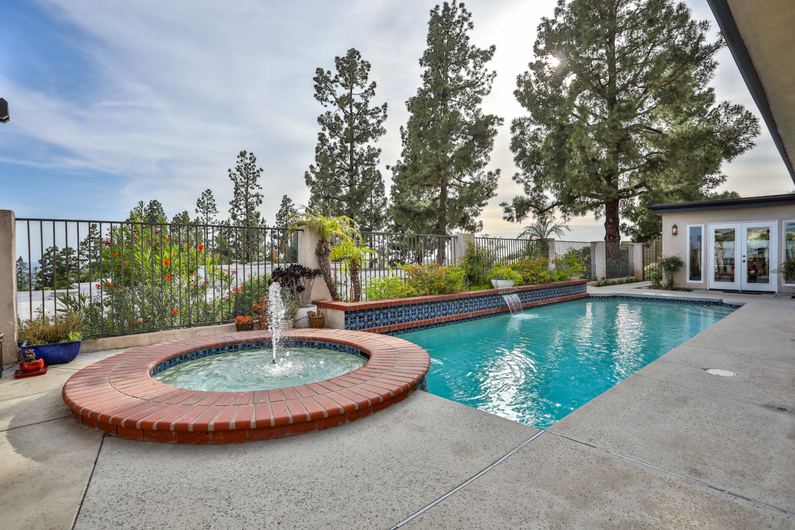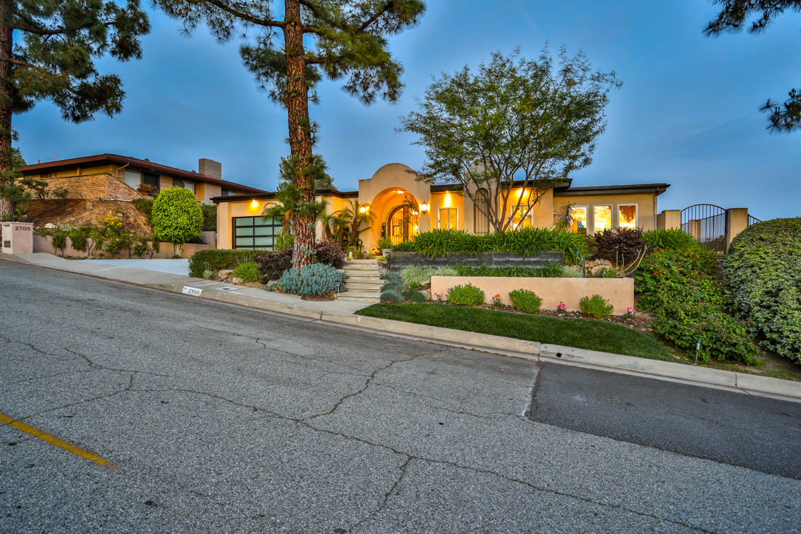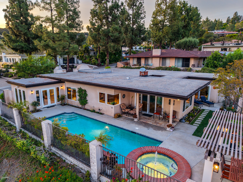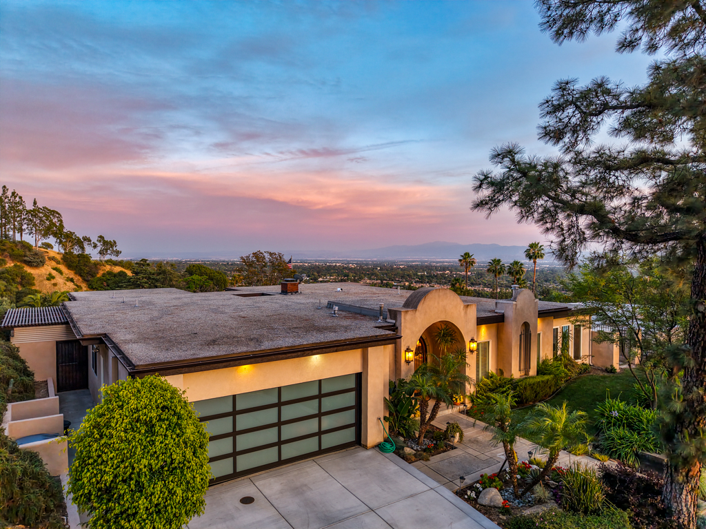 Custom built by Doug W. Henderson, a well-designed open floor plan offering walls of glass that enjoy an abundance of natural light and two impressive visual fireplaces. Professionally decorated with tasteful, timeless appointments throughout. Updated Chef's kitchen includes stone counters & opens to the family room. Dual paned windows and doors. Perfectly sited locale offering picturesque unobstructed valley, twinkling city lights, sunsets, & hillside mountain vistas. Sparkling pool & spa with impressive fountain water features, in a tranquil setting. A home truly perfect for entertaining and comfortable family living. An achievement in contemporary living in a one-of-a-kind trophy location.