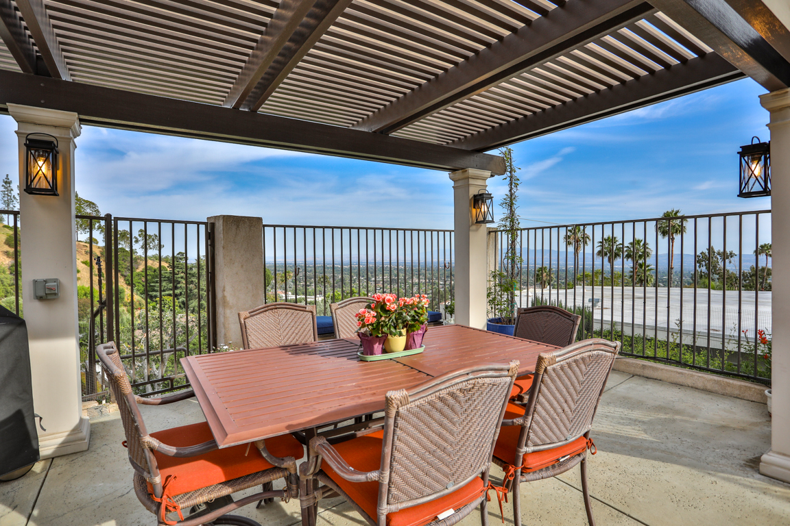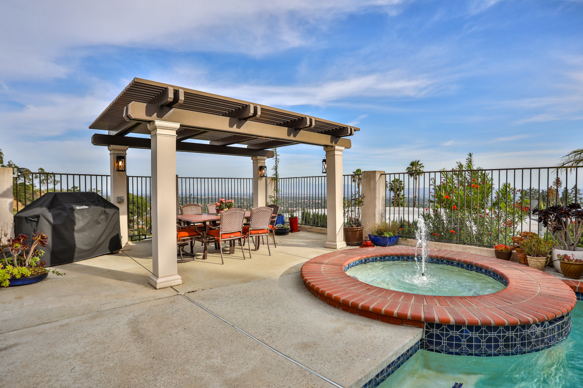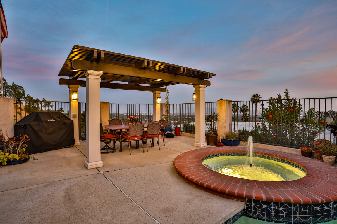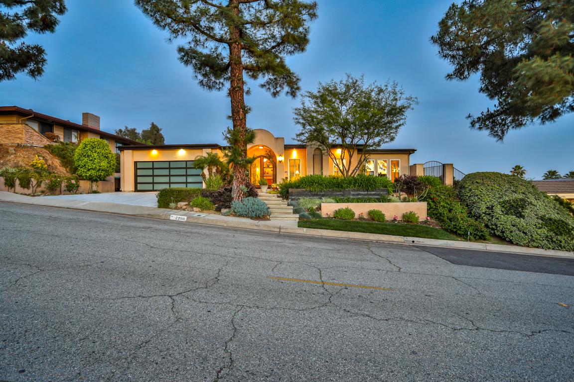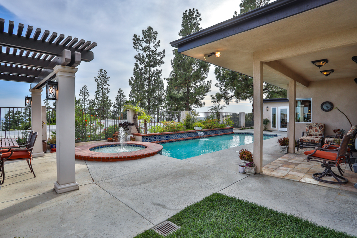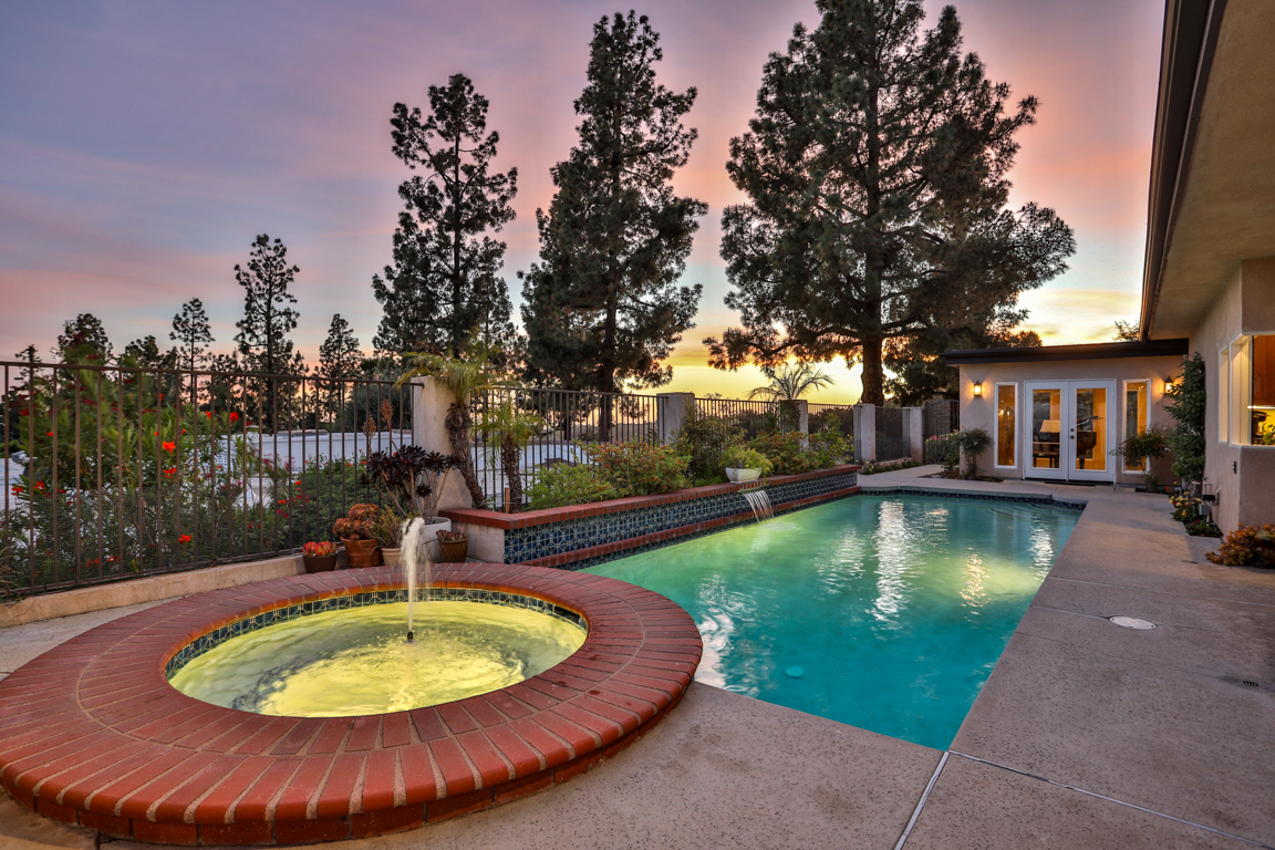 Custom built by Doug W. Henderson, a well-designed open floor plan offering walls of glass that enjoy an abundance of natural light and two impressive visual fireplaces. Professionally decorated with tasteful, timeless appointments throughout. Updated Chef's kitchen includes stone counters & opens to the family room. Dual paned windows and doors. Perfectly sited locale offering picturesque unobstructed valley, twinkling city lights, sunsets, & hillside mountain vistas. Sparkling pool & spa with impressive fountain water features, in a tranquil setting. A home truly perfect for entertaining and comfortable family living. An achievement in contemporary living in a one-of-a-kind trophy location.