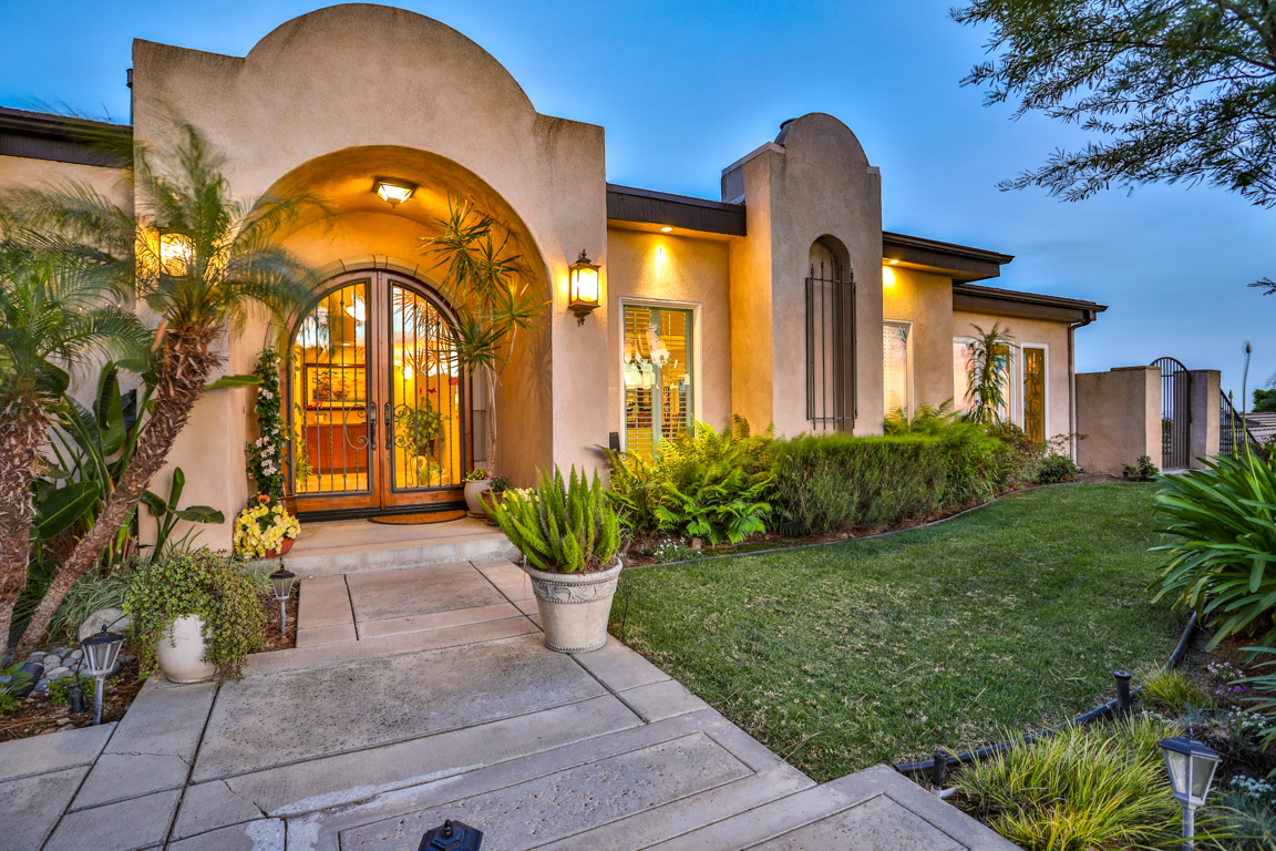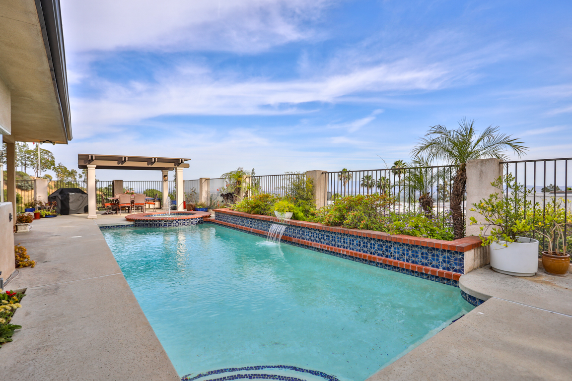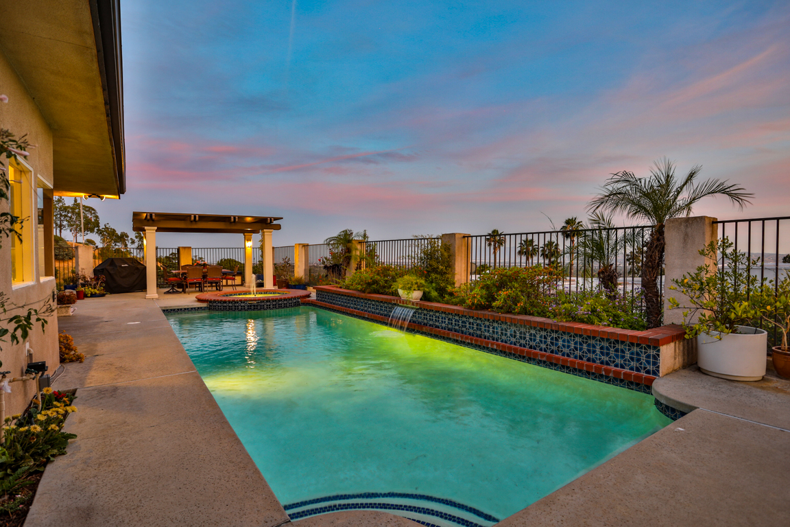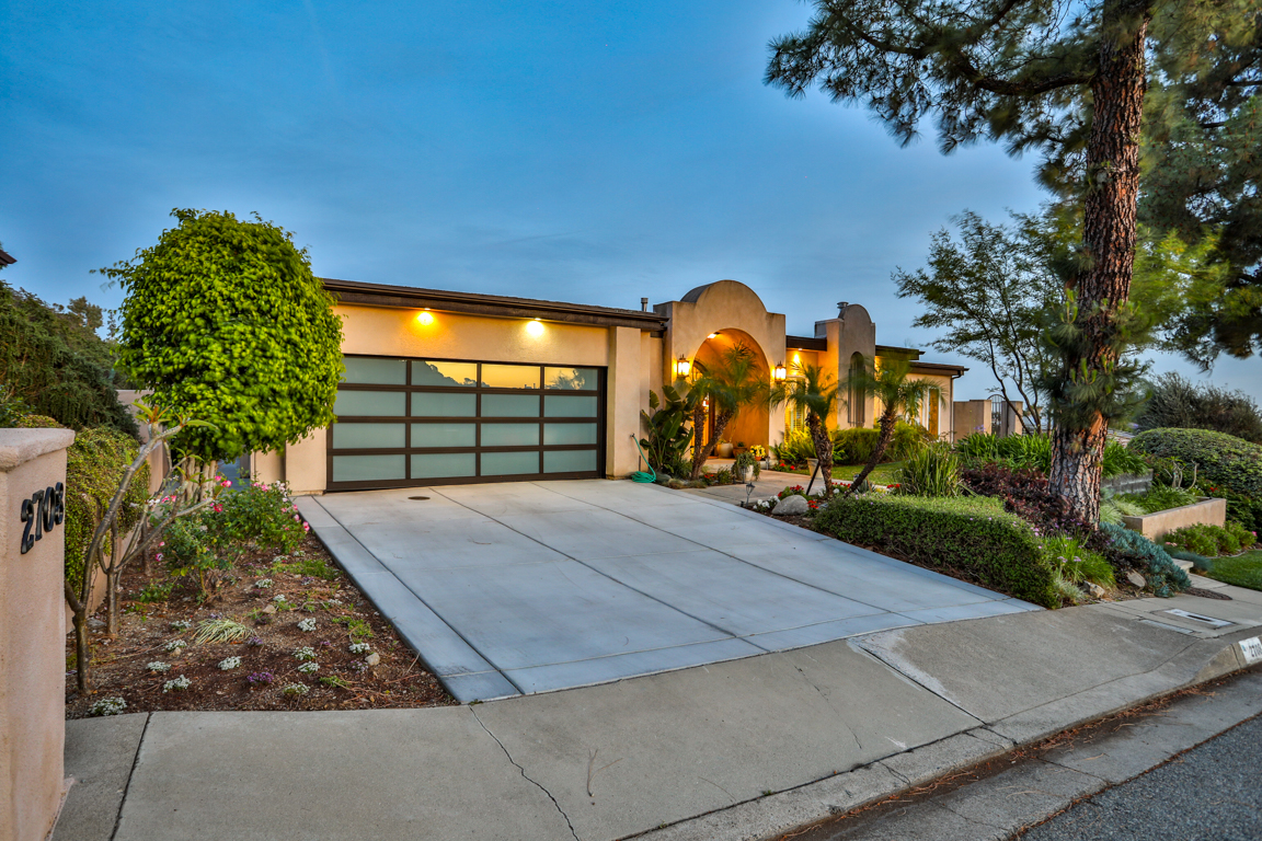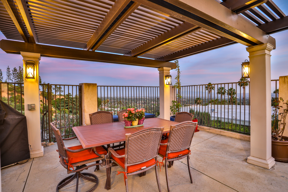 Custom built by Doug W. Henderson, a well-designed open floor plan offering walls of glass that enjoy an abundance of natural light and two impressive visual fireplaces. Professionally decorated with tasteful, timeless appointments throughout. Updated Chef's kitchen includes stone counters & opens to the family room. Dual paned windows and doors. Perfectly sited locale offering picturesque unobstructed valley, twinkling city lights, sunsets, & hillside mountain vistas. Sparkling pool & spa with impressive fountain water features, in a tranquil setting. A home truly perfect for entertaining and comfortable family living. An achievement in contemporary living in a one-of-a-kind trophy location.