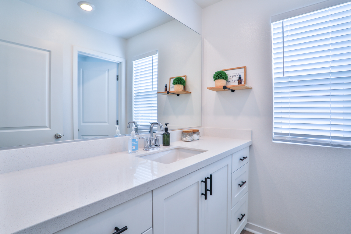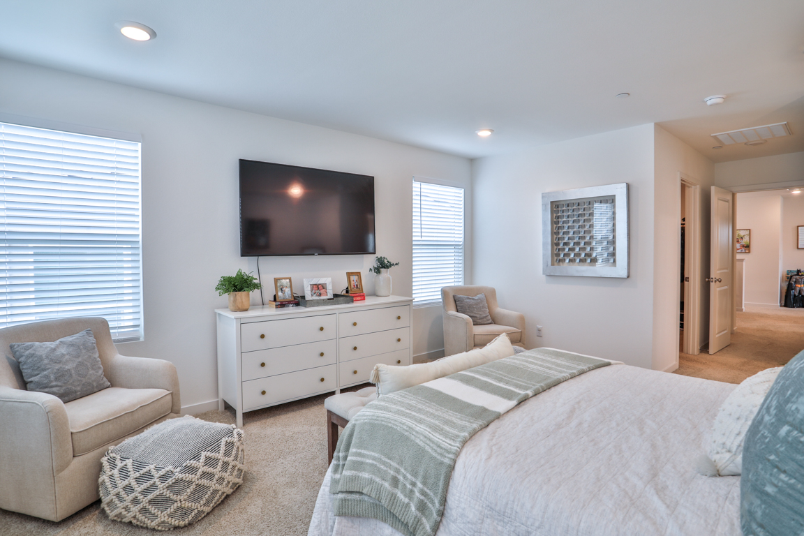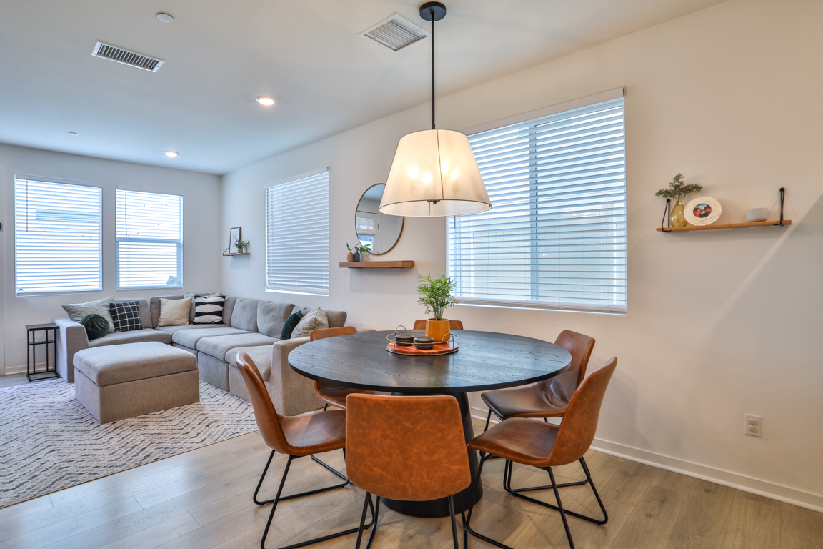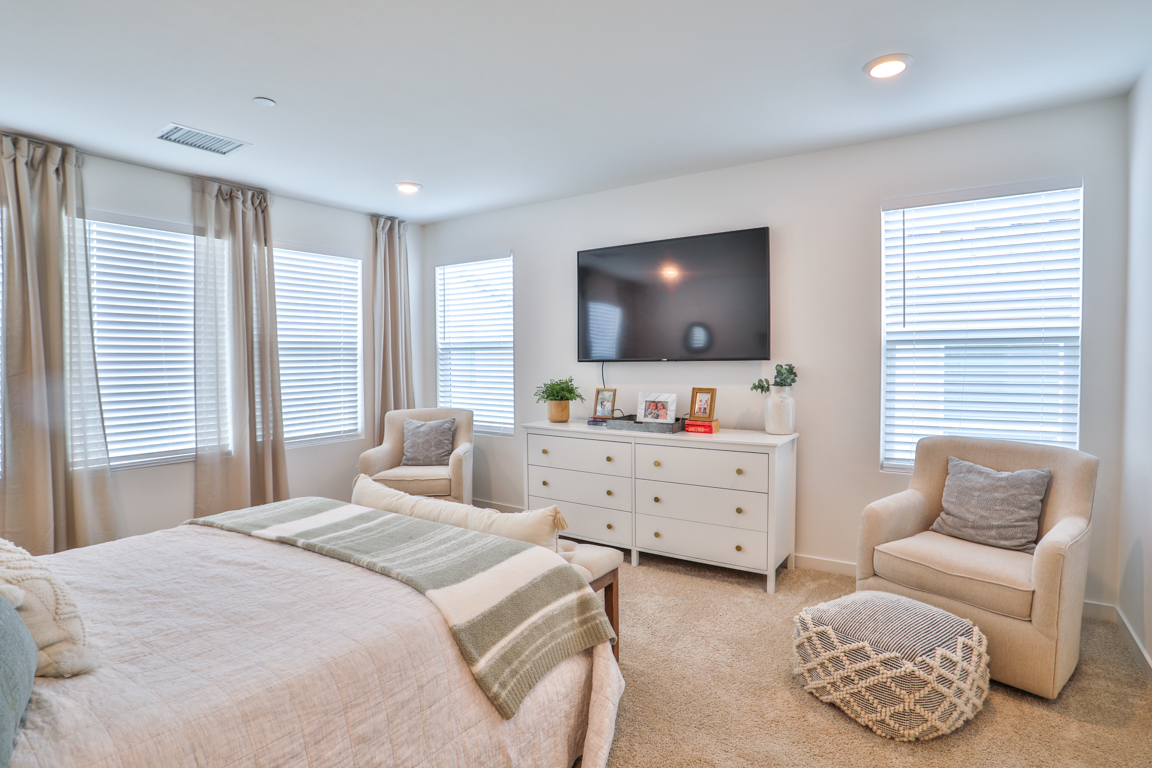 Epic price reduction! This Plan 2 Home at Serrano offers an exquisite floor plan, encompassing 2,059 square feet of thoughtfully designed living space. At the heart of the home, a spacious kitchen seamlessly flows into the dining and gathering rooms, creating an ideal space for both daily living and entertaining. The large kitchen island serves as a perfect centerpiece for hosting guests. A well-positioned guest bedroom and bath on the main level provide privacy and convenience. Upstairs, the private owner's suite offers a tranquil retreat, complemented by a luxurious bathroom featuring dual vanities, a soaking tub, a separate shower, and a generous walk-in closet. The second level also boasts two additional bedrooms that share a full bath, along with a versatile loft for extra living space. Designed with comfort in mind, this home includes high-end upgrades such as quartz countertops and wood laminate flooring. Taylor Morrison’s signature craftsmanship is evident in the soaring ceilings, expansive floor plan, designer paint, and modern exterior. The quaint rear yard is the perfect spot to relax, and residents can enjoy the community pool and spa for ultimate leisure and relaxation.