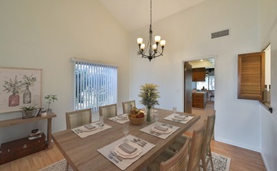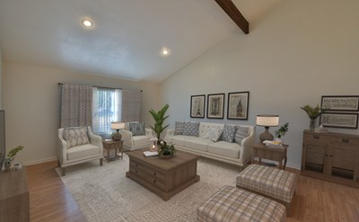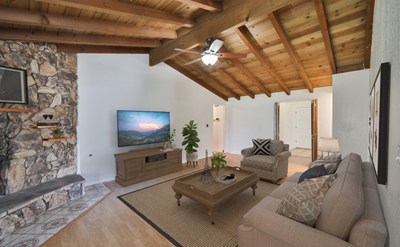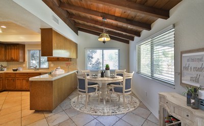 Move in ready single story home located on 1/2 acre corner lot. The charming white picket fence invites you into this ranch style home that greets you at the entry to vaulted ceilings & rustic wood beams that accent the architecture of this home. The large formal living & dining rooms are light & bright w/recessed lighting & wood-like flooring. The kitchen is located just off the dining room & offers lots of counter & cabinet space, as well as recessed lights, stainless steel dishwasher, gas range. The kitchen opens to a spacious dining area that flows into the family room featuring beamed ceilings, rock faced fireplace w/custom mantle pieces & unique wet bar w/sink & shutter doors that open to the dining room, perfect for hosting. The master bedroom again features the vaulted ceilings making this room feel grand along w/the double door entry & the large master bathroom that features dual sinks & separate vanity + large walk in closet w/mirrored doors & privacy toilet & shower. The remaining 2 bedrooms are equally spacious w/large closets & wood like flooring & share the hall bathroom. The backyard is beautiful with synthetic grass, large patio space & is surrounded by beautiful fruit trees that offer ample shade. The property features irrigation for the many fruit trees, wide gate for easy storage of toys or an RV and the land allows up to 5 horses. So many options with this amazing property.