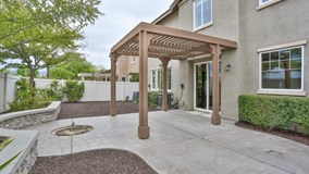 TWO CAR GARAGE WITH EPOXY FLOORING, VINYL FENCING, STAMPED CONCRETE WITH LATTICE COVERED PATIO , MATURE LANDSCAPING