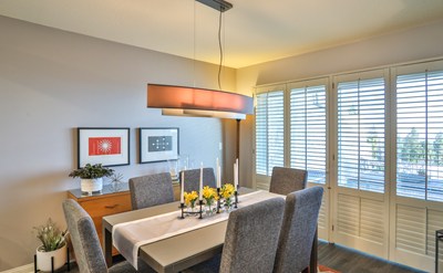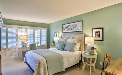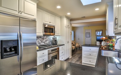 Private front Zen courtyard, formal entry, beautiful newer flooring. Spacious formal living family room with stone fireplace. Updated kitchen features granite counter, tile accents, custom cabinetry, Dacor oven w/built-in gas range, Bosch dishwasher, microwave & stainless steel refrigerator. “End unit” floor plan provides lots of light in addition to the kitchen garden window and skylights. Formal dining area and separate Den/Family room. Master bedroom with ensuite bath and dressing area. Custom designed plantation shutters throughout. Large guest bedroom features professionally organized walk-in closet.