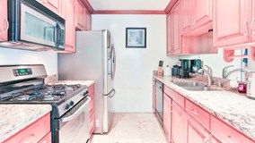 Home is on the second level, just steps away from the elevator and offers a granite kitchen with stainless steel appliances, beautiful wood cabinets, and travertine marble floors. Open combination layout with oversized windows and sliding glass doors invite an abundance of light and breeze. Throughout the home, enjoy rich hardwood floors, recessed lighting, smooth ceilings, crown molding, custom paint, and central air and heat. Desirable hallway closets with plenty of space for storage and in unit washer and dryer.