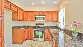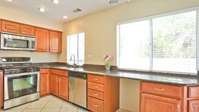 Stylish contemporary in gated California Crossings community offers soaring ceilings, living room fireplace and gorgeous remodeled kitchen with dark wood cabinetry, granite countertops & stainless appliances. Spacious master bedroom suite has oval tub bath with dual vanities. Rear yard and covered patio with barbeque area & fruit trees. New interior paint and carpeting throughout. Location is close to the Claremont Village, bus lines & Metrolink station.