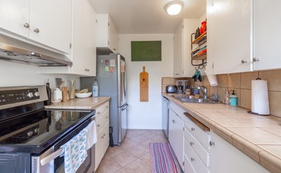 Hard to find 2 bedroom townhouse style unit with large private patio off the dining room and additional balcony off master bedroom and gas fireplace in living room. Dark stained parquet floors, stainless steel appliances in kitchen including dishwasher. Large laundry room with additional storage area. Upstairs features 2 nice size bedrooms and 1 full bath. 1 car garage included and plenty of guest parking. Village Green is a historic property with Mills Act for lower property taxes, and a park-like setting with mature trees and large grassy areas that make it a hidden gem in a central location near shopping, entertainment and the Expo subway line. This won't last and units this nice with these features don't come available often.