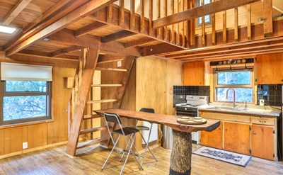 Cabin is approx. 420 sq.ft. offering a light filled 2-level open versatile floor plan with bedroom area loft, kitchen area, and 1 bath. Dual-pane windows and protective security shutters. Electricity and private sewage system on premises. Construction was inspired by traditional vault cabin ceiling design. Great room setting enjoys magnificent forest and valley views. The private deck captures magical moments in the forest. Old growth Cedar and Pine trees and a perched birds-eye view of the valley below. Prime locale to the base of a scenic trail head that reaches the San Antonio Falls and the Baldy Notch, and the Ski Hut. When snow falls, the scene transforms into a winter wonderland!