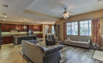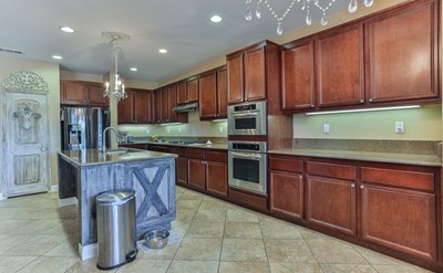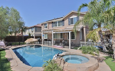 Beautiful pool home in the Rosetta Canyon Community featuring 4 bedrooms + den and 3 FULL bathrooms. Just minutes from shopping, dining, the lake, and the 15 FWY-this home is in a prime location! Step into the beautiful entryway and formal dining room which features 24" diamond patterned tile floors. From here the space flows into the open concept floor plan featuring the expansive kitchen, spacious informal dining area and large living area. The kitchen has granite countertops, tons of cabinets with under cabinet lighting, recessed lighting, large walk-in pantry with custom door, customized kitchen island with rustic features & bar seating, and stainless steel appliances. The spacious informal dining area comes with extended counter tops & cabinets to provide a buffet area, with views to the backyard's custom pool. The large family room comes with high ceilings, rustic looking laminate flooring & cozy fireplace. Downstairs also features a den with recessed lighting that can easily be converted into a 5th bedroom, with a nook perfectly suited to be a closet. The downstairs FULL bathroom comes with a shower & tub combo making it perfect for guests. Upstairs is the huge master bedroom which features a raised master retreat complete with a fireplace. The master bathroom features a separate tub & glass enclosed shower, private toilet room, dual sink + vanity, and 2 closets. The remaining 3 bedrooms are all spacious and feature mirrored closet doors and share the upstairs bathroom that has dual sinks and a combo tub & shower. The upstairs also has a loft area and a laundry room which includes cabinets and a sink. Outside is your private oasis which includes a covered patio, custom salt water pool & spa with security gate (approx. 5 yrs old), custom tiered astro turfed area with a beautiful California Pepper tree to offer shade as you enjoy the gorgeous view of the valley behind you with NO neighbors peeking in your backyard. The home also features a SOLAR PANEL lease, keeping the cost of utilities down on this oversized, pool home! This home has a LOW HOA fee located in the Rosetta Canyon HOA which features amazing amenities, including but not limited to a sports park featuring football, basketball, baseball, & tennis courts, dog park, kids park, & RV parking!