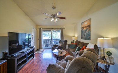 This nicely upgraded upper unit, includes a view of the golf course, all the appliance, laminated wood flooring. Good size bedroom with lots of closet space. Vaulted ceilings, balcony with convenient laundry closet with washer and drying. HOA includes the water/hot water, trash.