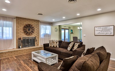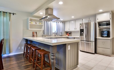 recessed lighting and refinished cabinets in cool grey. Enjoy gatherings in the generously-sized dining space with long counter top bar area,