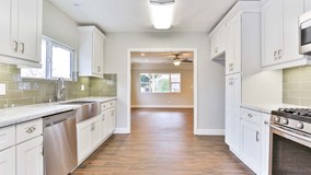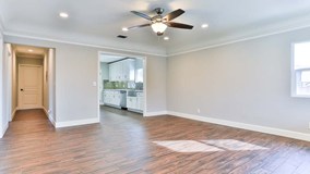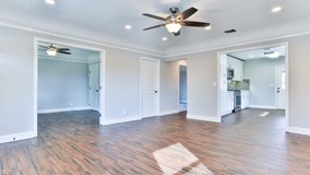 farmhouse sink. Spacious living room has recessed lighting and ceilings fan. Master