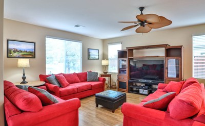 Beautiful Four Seasons Hemet! A 55+ active adult community where resort living is carefree and easy. Enjoy exceptional golf course views from this gorgeous 2,755 square foot home. There are 3 bedrooms, a den/office and 3 bathrooms in this versatile floorplan. The living areas have soaring ceilings and loads of dual paned windows. These rooms are light and bright and feature easy care wood laminate flooring. The kitchen features a center island, dark wood cabinets, stone counters, and newer appliances. All of the bedrooms are large with plenty of closet space and carpeted floors. The luxurious main bedroom has walk-in closets and a large spa like bathroom with a relaxing soaking tub, separate shower and dual sinks. The 2 additional bedrooms share a large jack and jill bathroom and are on the opposite side of the house from the den, and main bedroom. This arrangement provides plenty of privacy for you and your overnight guests. Enjoy evenings in the backyard overlooking the golf course with lovely views of the nearby hills and mountains. This gate guarded community offers a fantastic resort setting surrounding an 18-hole golf course. The community amenities include tennis, a pool and spa, bocce ball, horseshoes, shuffle board, a garden and a gazebo. There is a fitness center, billiard room, computer lab, movie theater, bistro, and many social activities for you to enjoy. What a wonderful atmosphere for relaxing or for entertaining family and friends. This is a very well maintained home in a desirable location within the community...see it today!
