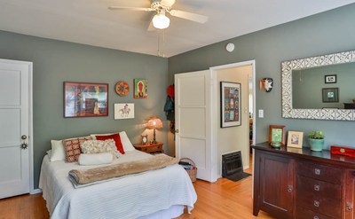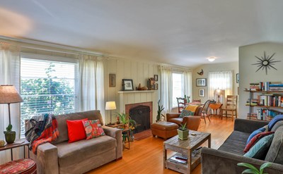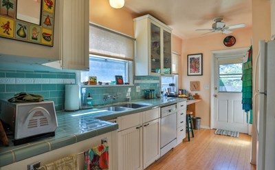 Situated on an idyllic cul-de-sac street, this 1948 light filled home offers eclectic details with traditional accents. Its undeniable charm is evident from the moment you approach. Almost immediately, its drought tolerant landscaping and front yard draw you in. An inviting covered entry porch leads directly into a traditional foyer. The living room has original oak wood floors and a romantic fireplace flanked by two picture windows. The well-appointed galley kitchen has a coveted Wedgewood stove, tiled countertops, butcher block prep area and bar! The master bedroom is spacious and offers plenty of space for additional activities .The second bedroom has direct access to the private back garden oasis adorned with fruit and shade trees.