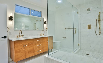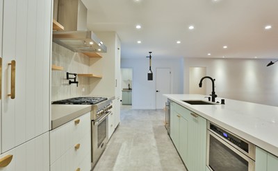 Great-room with kitchen, living room and dining room is surrounded by floor-to-ceiling sliding glass doors and ample natural light. Full chef's kitchen includes Thermador appliances and Caesarstone countertops.