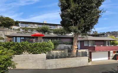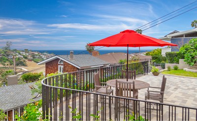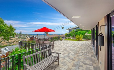 Ocean views and canyon panorama setting at the end of Wykoff Way. Renovated mid century classic with an emphasis on indoor/outdoor living. Nestled in Bluebird Canyon, this enticing piece of architectural history has been carefully restored to a progressive design and is surrounded by inspiring scenery. Modern double sliding door entry leads into the open living space with gas fireplace. Dedicated dining space is adjacent to the kitchen with Red Oak bar top and wine refrigerator. Contemporary kitchen with honed granite countertops, slate stone backsplash and custom maple cabinetry with pantry pull out storage. Clean lines and natural light throughout, including skylights in the kitchen. Stainless steel appliances including Dacor professional six burner gas range, Bosch dishwasher plus French door refrigerator/freezer and stackable Whirlpool washer/dryer included. Home has undergone extensive remodeling, inclusive of replacement of windows, doors, sliders, flooring, lighting, furnace/ducting, electrical, copper plumbing, media wiring, tankless water heater, roof. Two dedicated bedrooms plus a bonus for a third. Three modern bathrooms with tasteful selections of stone and wood materials. Two car garage with storage and workbench. Outdoors enjoy a large flat front view patio, garden yard with fruit trees and upper view terrace. Just minutes to The Village, beaches, Bluebird Park, Bluebird hidden tennis court and all the best of Laguna Beach.