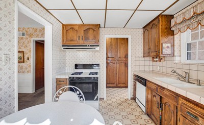 Immediately the character-rich details of a bygone era greet you, from plaster walls exuding classic charm, to the gracefully raised foundation providing elevation and architectural interest. The large front window, a charming fireplace, the curvature in the ceiling… every detail contributes to the timeless elegance of the living space in this mid-century gem. The spaciousness of the open living room allows for flexible furniture arrangements, making it an ideal setting for both intimate family moments and larger social gatherings. Beneath the existing carpets, the hardwood floors await rediscovery, offering the opportunity to restore and showcase the authentic beauty of the home's original flooring.