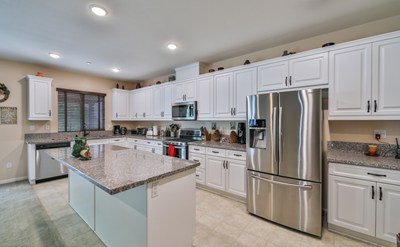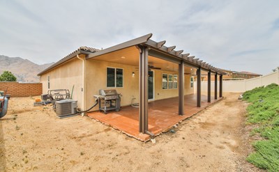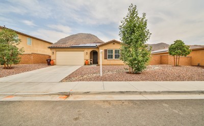 Few years young single story home with 3 bedrooms + den and NO HOA's! This home features both eco & budget friendly drought tolerant landscaping & solar panels! The spacious entryway has tile flooring that leads you to the huge open floor plan kitchen, living and dining space. You'll never run out of cabinet or counter space in this kitchen which also features a large island with bar seating, recessed lighting, massive walk-in pantry, stainless steel appliances with a dual oven stove. Down the hall you will find 2 large bedrooms and a spacious den or office, which features a walk-in closet, making it easy to turn this space into a potential 4th bedroom. The hallway bathroom comes with dual sinks & privacy door to the shower & toilet. The large master bedroom is separate from the other bedrooms, complete with a large master bathroom featuring a separate shower/tub, dual sinks & huge walk-in closet. The backyard has a sprawling alumawood covered patio with led lights & 2 lighted ceiling fans in the very private backyard. With this home just built in 2018 it has built in fire sprinklers, tankless water heater, and rain gutters. Close to the freeway, shopping centers, and great hiking!