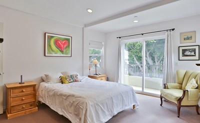 Second bedroom boasts mirrored closet doors with full bathroom right outside. Upper floor balcony wraps around and is accessible from both bedrooms.