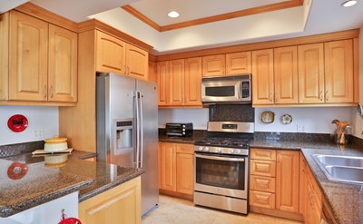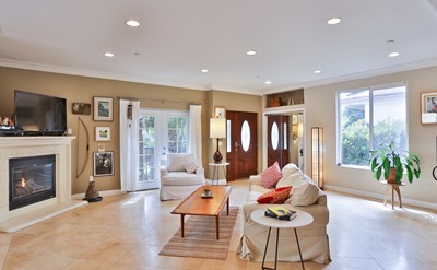 Large living room with gas fireplace, crown molding and recessed lighting opening to dining area and nice size kitchen with granite counter tops, stainless steel appliances & approx 1 yr. old stove. French doors lead to front patio off living room and cozy side patio off of dining area.