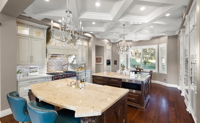 Enter to find a dramatic entry and formal living and dining spaces that are perfect for special occasion entertaining. Shining wood floors greet you as you move throughout the property. 4-6 potential versatile bedrooms. You will find a spectacular remodeled and fully upgraded kitchen with custom cabinetry that offers dual islands and professional grade appliances, including a Wolf 6 burner cook top, microwave and warming oven. There is a Subzero refrigerator and freezer and a Bosch dishwasher. Every detail was attended to in the thoughtful design of this space. That includes upgraded granite counters and a farm style sink. As an added bonus, the kitchen includes a nook and overlooks the family room creating a great room effect where everyone can be included in the festivities. The family room offers a view of the stunning backyard that boasts a gorgeous cabana and outdoor kitchen as well as a sparkling pool and spa.