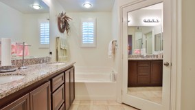 The kitchen is equipped with granite countertops and stainless steel appliances. Plantation shutters and tile flooring maintain a cool feel even in the hottest of summer days. And, the master en suite offers the relaxation of a soak-in tub and convenience of a double sink vanity and a separate walk-in shower.